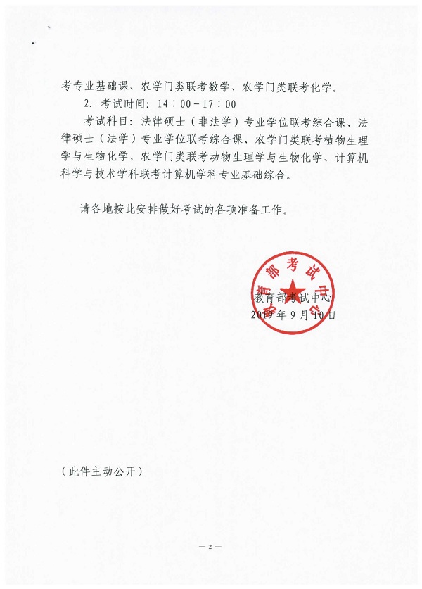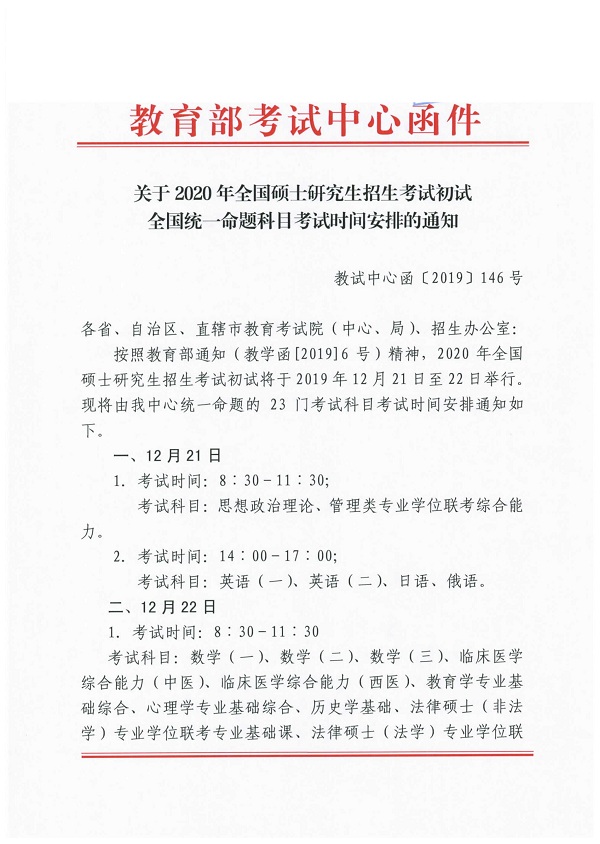 关于2020年全国硕士研究生招生考试初试全国统一命题科目考试时间安排的通知
